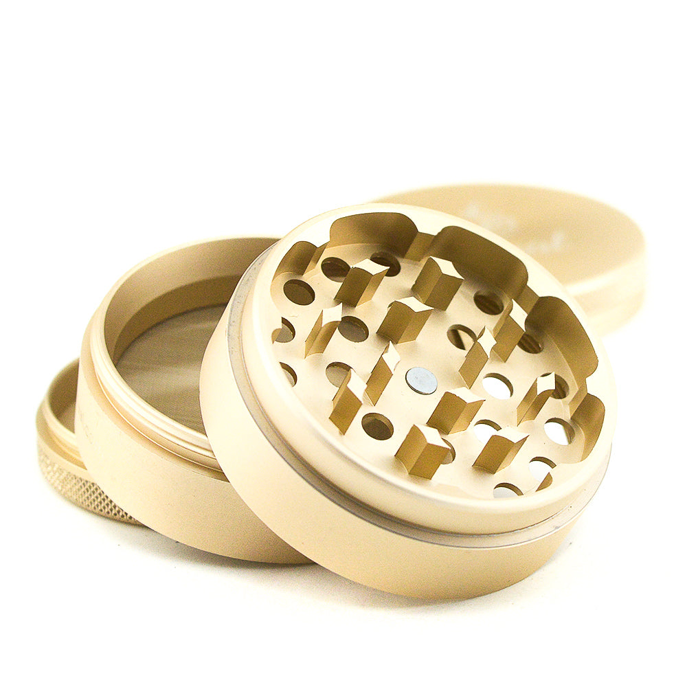 This manual 4 part grinder features razor-sharp diamond shaped teeth on the top and bottom of the chamber to effortlessly grind your product to perfection.